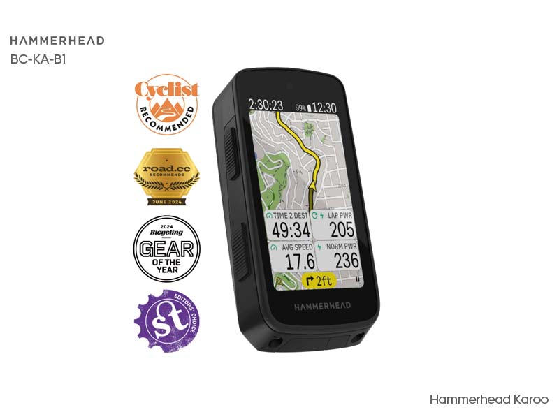 Hammerhead Karoo自行車錶代表著創新、設計與性能的巔峰。絢麗的螢幕、頂級的材料,配上可以操整天的電池電量使 Karoo 自行車錶成為一款毫無妥協的錶中豪傑。相當周到的軟硬體設計,使 Karoo 在任何情況都能簡易操作,讓你專心在路況與騎乘,而不是專注於你的設備。具有全面的結構化訓練支援、業界最佳的導航以及專屬配套 App 和儀表介面,讓你無需將設備從把手上取下即可全面掌握你的 Karoo 自行車錶; Karoo 幫助你達成訓練目標、探索新路線並享受每次騎乘。而 Karoo 讓你隨心所欲地掌控車上連接的各式零件,從 SRAM AXS 產品到電輔自行車再到 ANT+ 燈具。
