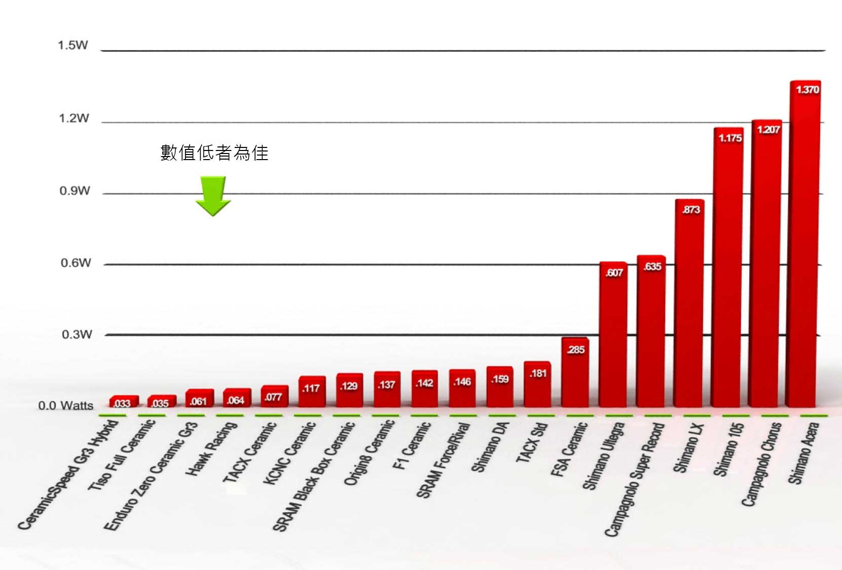 .共檢驗了三種軸承技術 (陶瓷滾珠培林、鋼滾珠培林 以及套筒軸襯) 陶瓷滾珠培林平均損耗 0.056 瓦/個。鋼滾珠培林平均損耗 0.069 瓦/個。套筒軸襯平均損耗 0.577 瓦/導輪