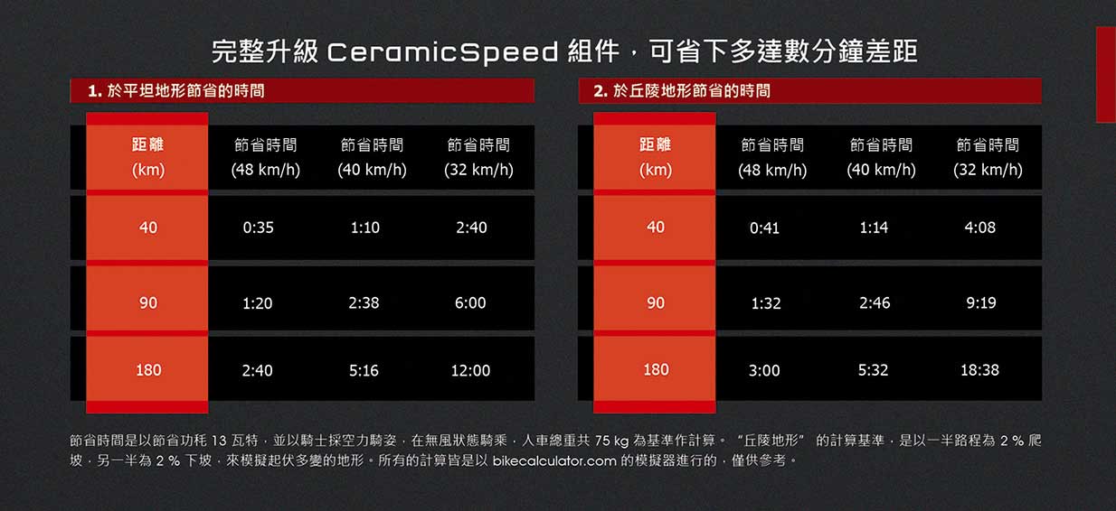 ( 節省時間是以節省 13 瓦功耗為準,並以騎士採空力騎姿於無風狀態下騎乘,且人車總重 75 公斤為基準作計算。“丘陵路線” 的計算基準,是以一半路程為坡度 2% 上坡,另一半為坡度 2% 下坡為準,來模擬起伏多變的地形。所有計算結果皆是由 bikecalculator.com 的模擬程式得出,僅供參考。)